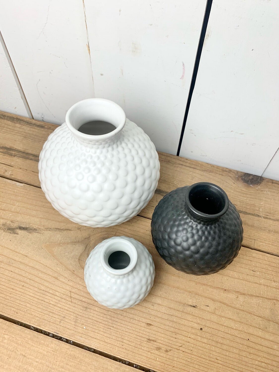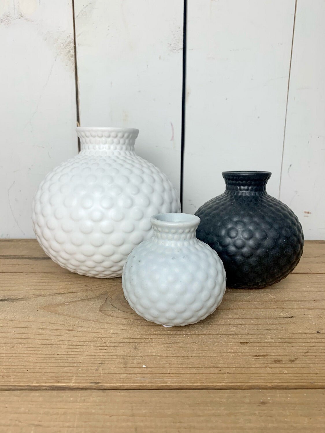 In colors ranging from white, to gray, to black, this trio of decorative vases really stand out on a tabletop or shelf. Sold individually.